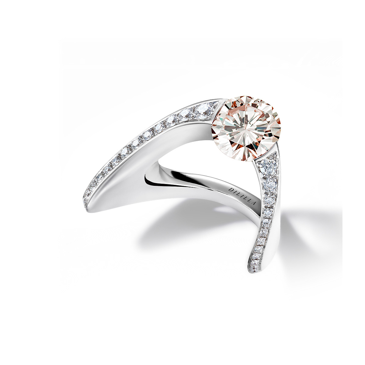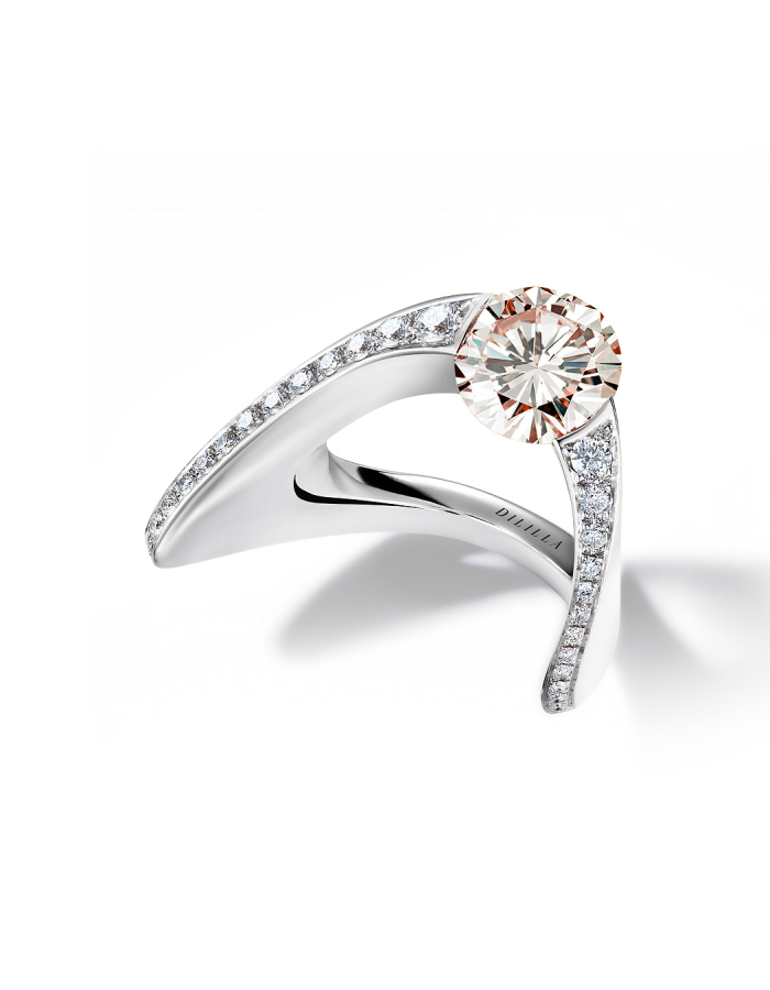 Cassiopea è un anello che racchiude il bagliore delle stelle più lontane, un frammento di luce che illumina la notte con la sua intensità unica. Il diamante lab grown fancy rosa centrale, fulcro del design, splende come una costellazione nel cielo infinito.