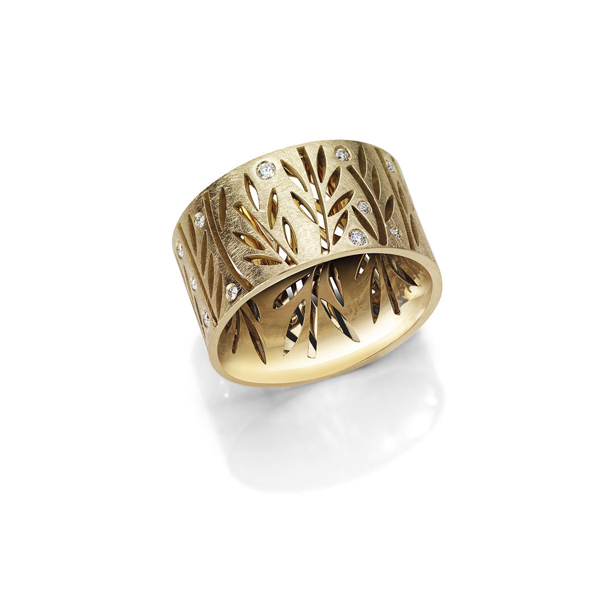 L’oro giallo richiama il calore della terra, avvolgendo con delicatezza la struttura sinuosa dell’anello. I diamanti, incastonati con precisione, donano una luminosità raffinata, evocando la luce che filtra tra le foglie di bambù al sorgere del sole.