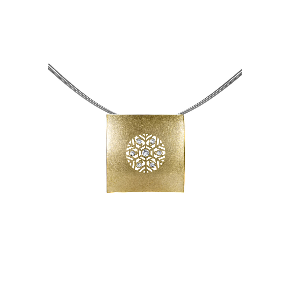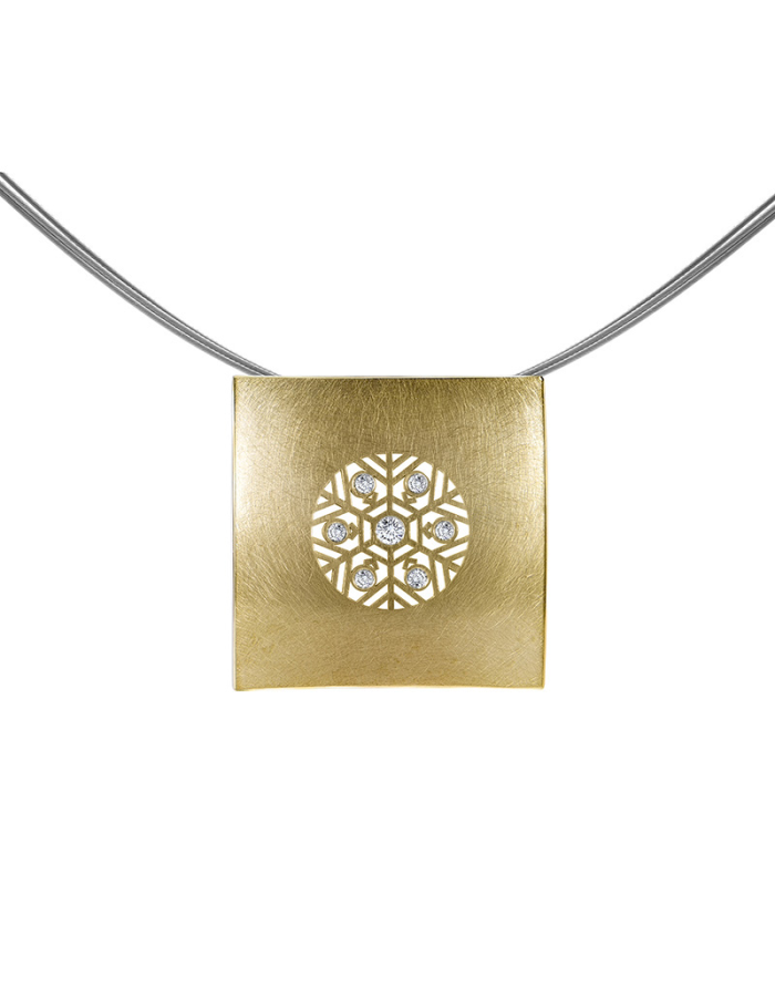 Le linee delicate e armoniose del pendente richiamano la leggerezza della neve che si posa silenziosa, avvolgendo il mondo in un abbraccio di luce. Ogni dettaglio racconta la magia di un istante sospeso nel tempo, dove la bellezza si fa eterna.