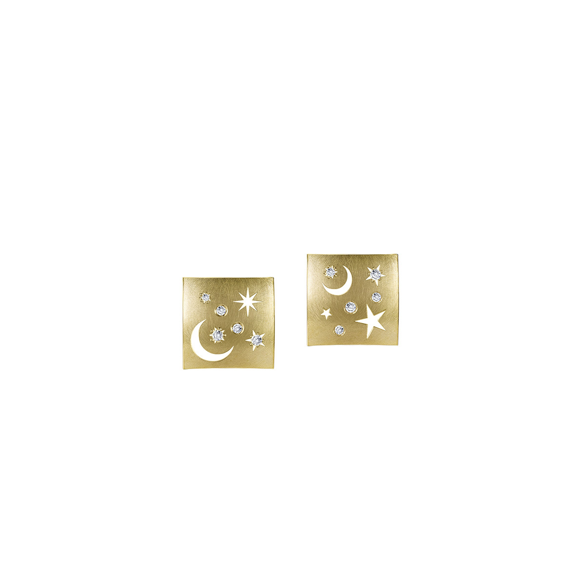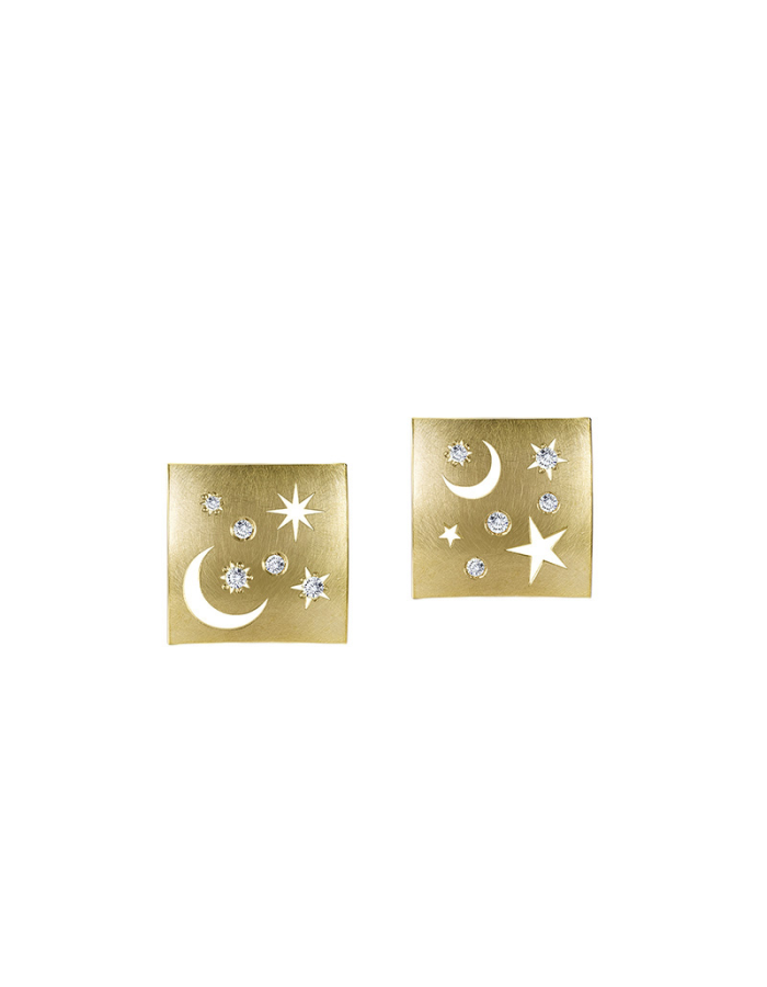Orecchini che racchiudono la quiete del cielo notturno, dove i diamanti risplendono come stelle sospese nel tempo. L’oro, morbido e avvolgente, dona calore a questa danza di luce.