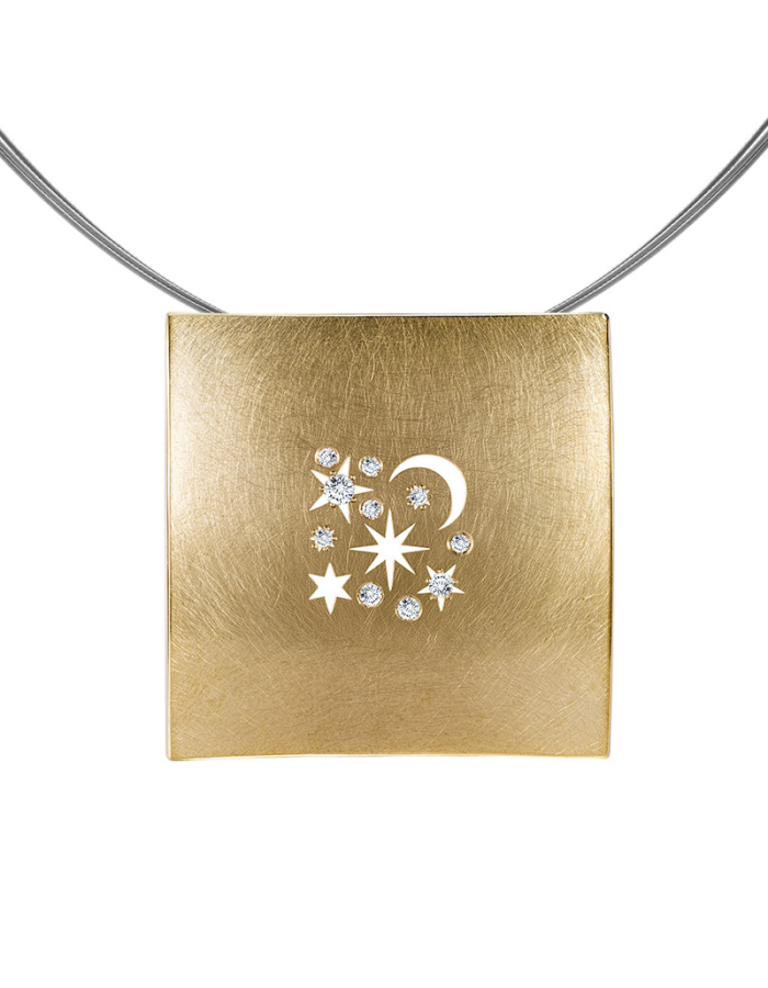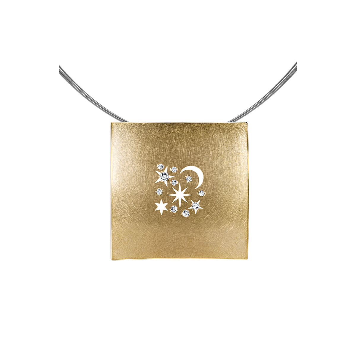 Un pendente che racchiude la quiete del cielo notturno, dove i diamanti risplendono come stelle sospese nel tempo. L’oro, morbido e avvolgente, dona calore a questa danza di luce.