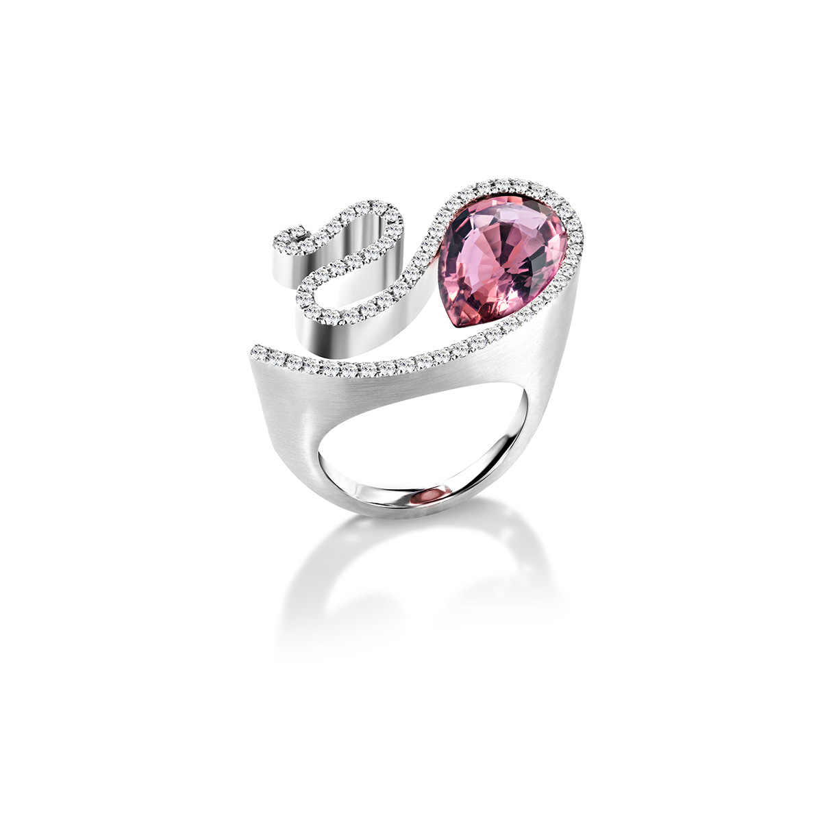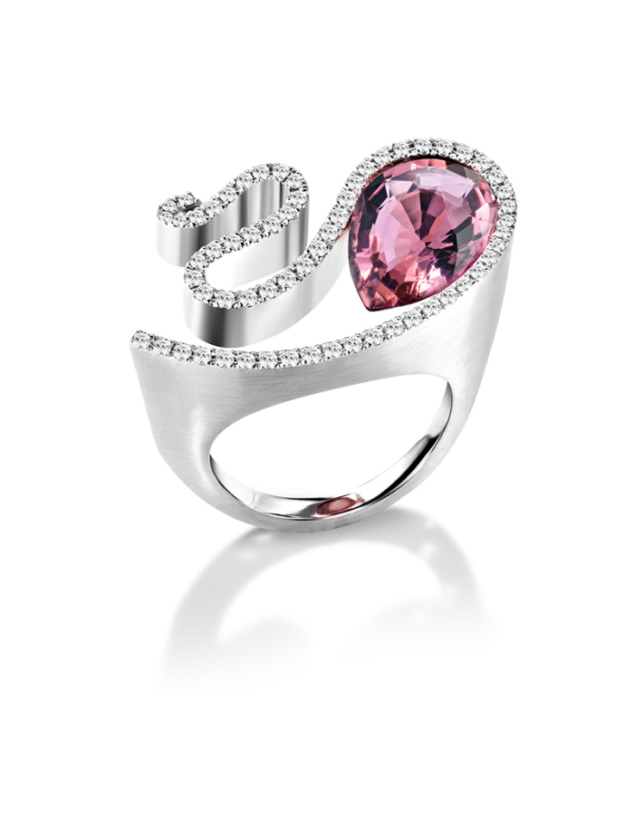 Anello in oro bianco tit. 750/000 con diamanti taglio brillante, per ct. 0.24, e Rubellite taglio a Goccia, per ct. 5.94
