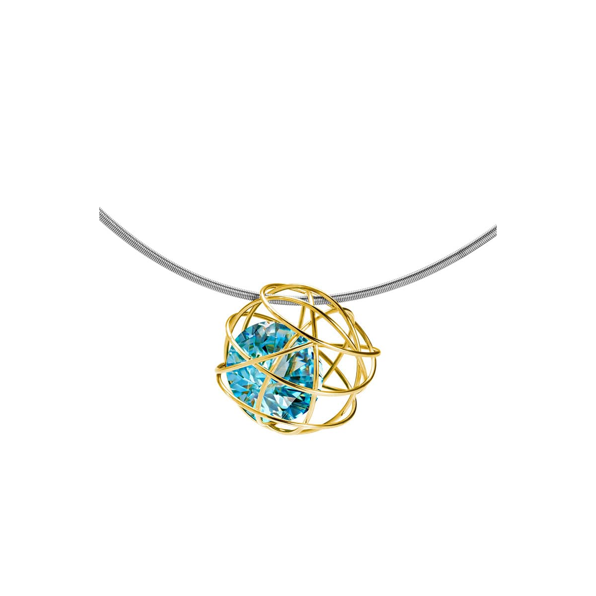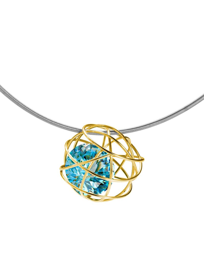 Un filo d’oro sottile e luminoso si avvolge con grazia attorno a una gemma profonda e vibrante, come un abbraccio delicato che allo stesso tempo protegge ed esalta. Il topazio azzurro, con il suo colore intenso e cristallino, sembra sospeso in una danza leggera, nascosto e rivelato in un gioco di equilibri perfetto.