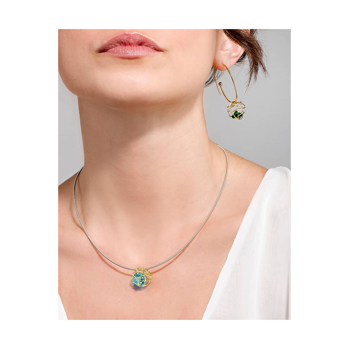 Pendente realizzato a mano in oro giallo con finitura lucida, con topazio azzurro dal diametro di 10 mm. Il pendente, dal diametro esterno di 15 mm, è accompagnato da un girocollo flessibile in acciaio inossidabile con uno spessore di 0,80 mm e una lunghezza a scelta di 40 o 42 cm.