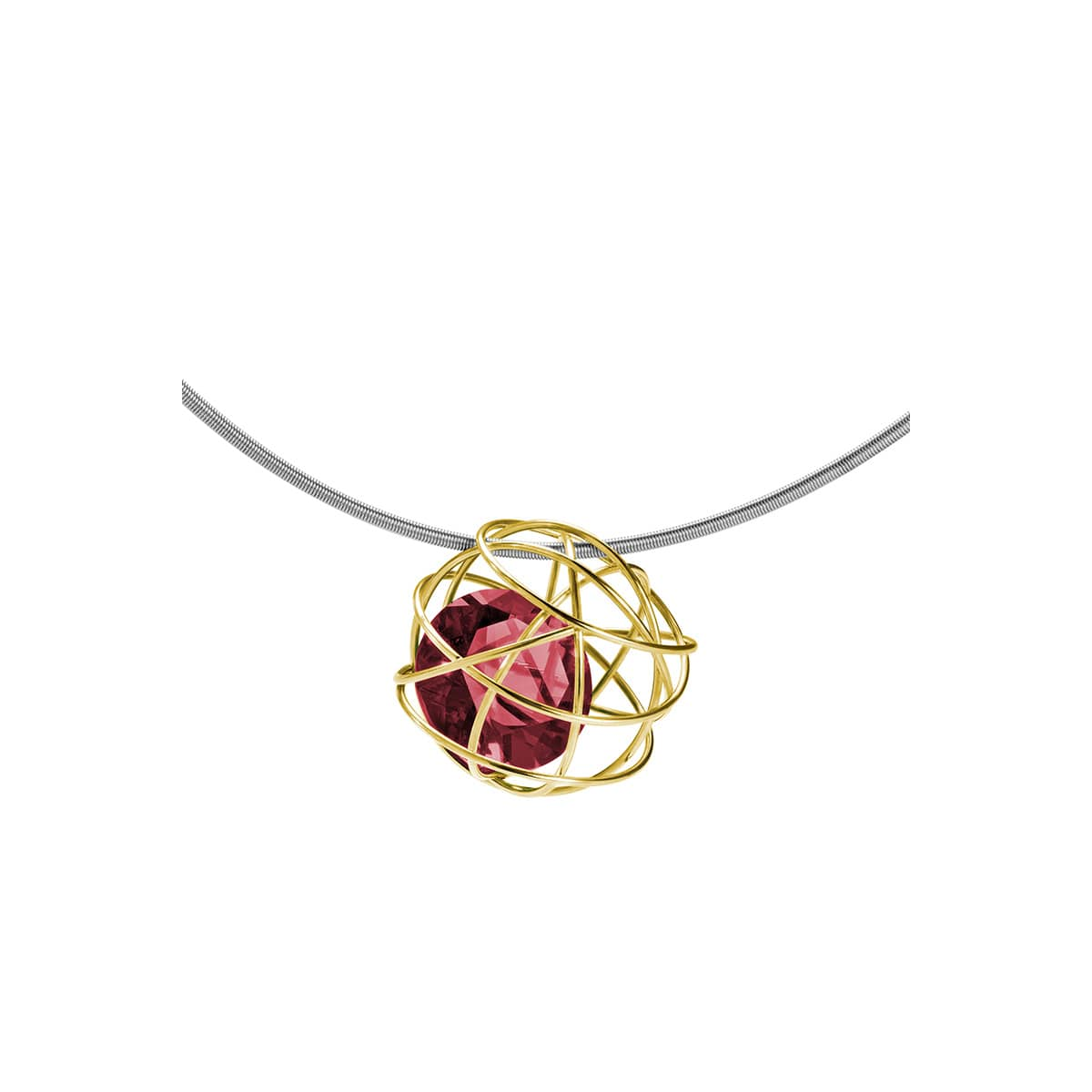 Pendente realizzato a mano in oro giallo con finitura lucida, con zircone rosso dal diametro di 10 mm. Il pendente, dal diametro esterno di 15 mm, è accompagnato da un girocollo flessibile in acciaio inossidabile con uno spessore di 0,80 mm e una lunghezza a scelta di 40 o 42 cm.