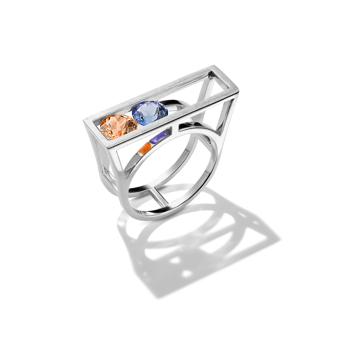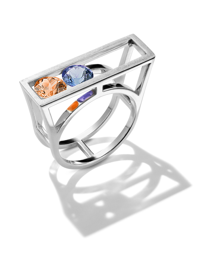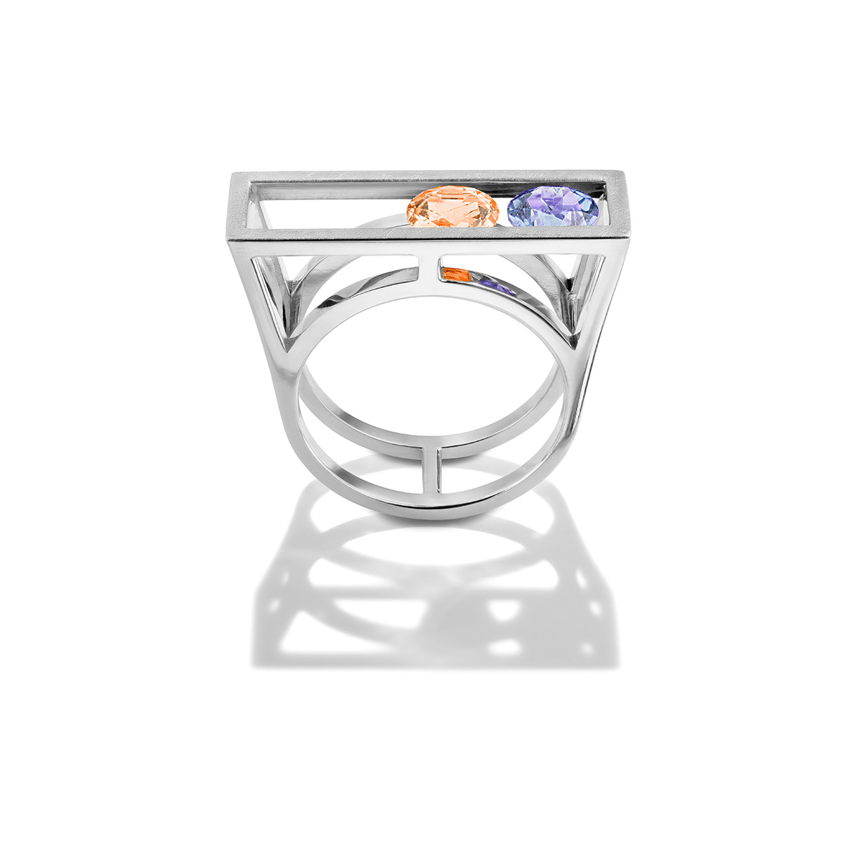 Ispirato al dinamismo delle forme pure, Prism Motion racchiude l’incontro tra due gemme che sembrano inseguirsi in un movimento continuo. La tanzanite, simbolo di mistero e intuizione, danza accanto al granato mandarino, che evoca energia e passione vibrante.